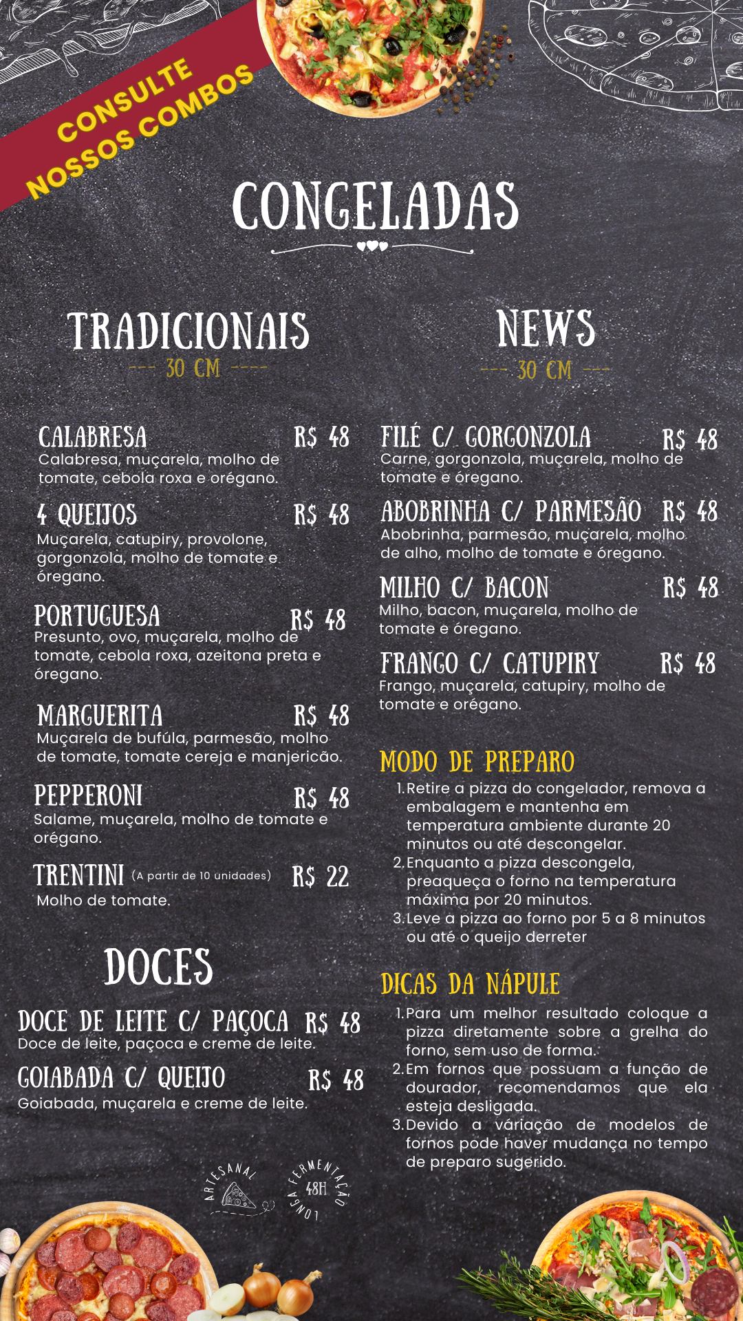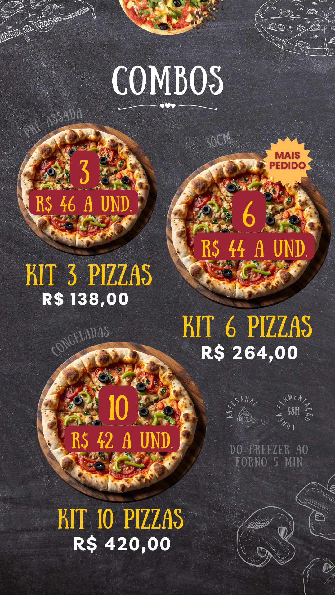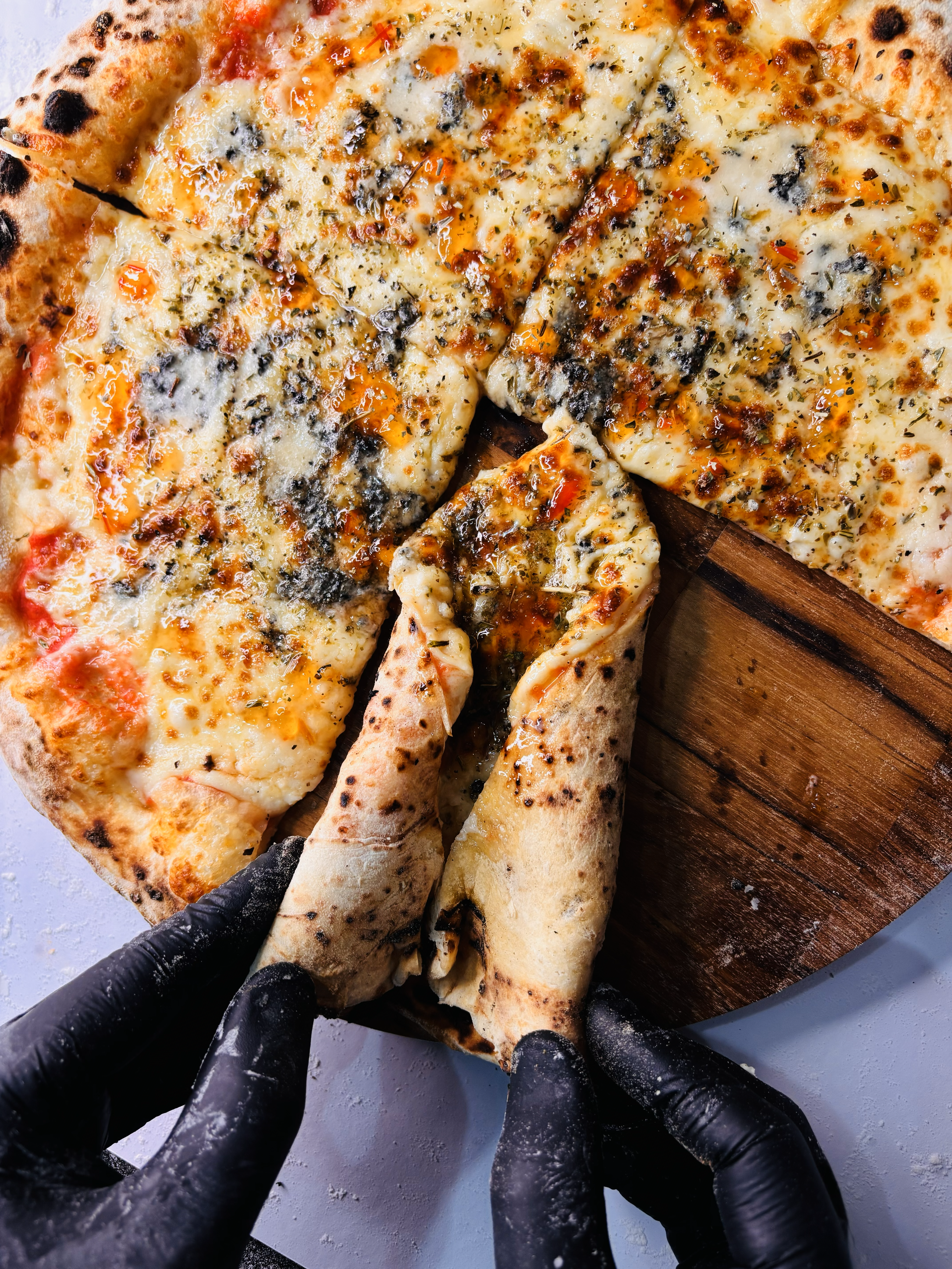 Assamos em forno de lastro, mantendo umidade e estrutura. Após o congelamento, a pizza volta ao forno e fica crocante por fora e macia por dentro.