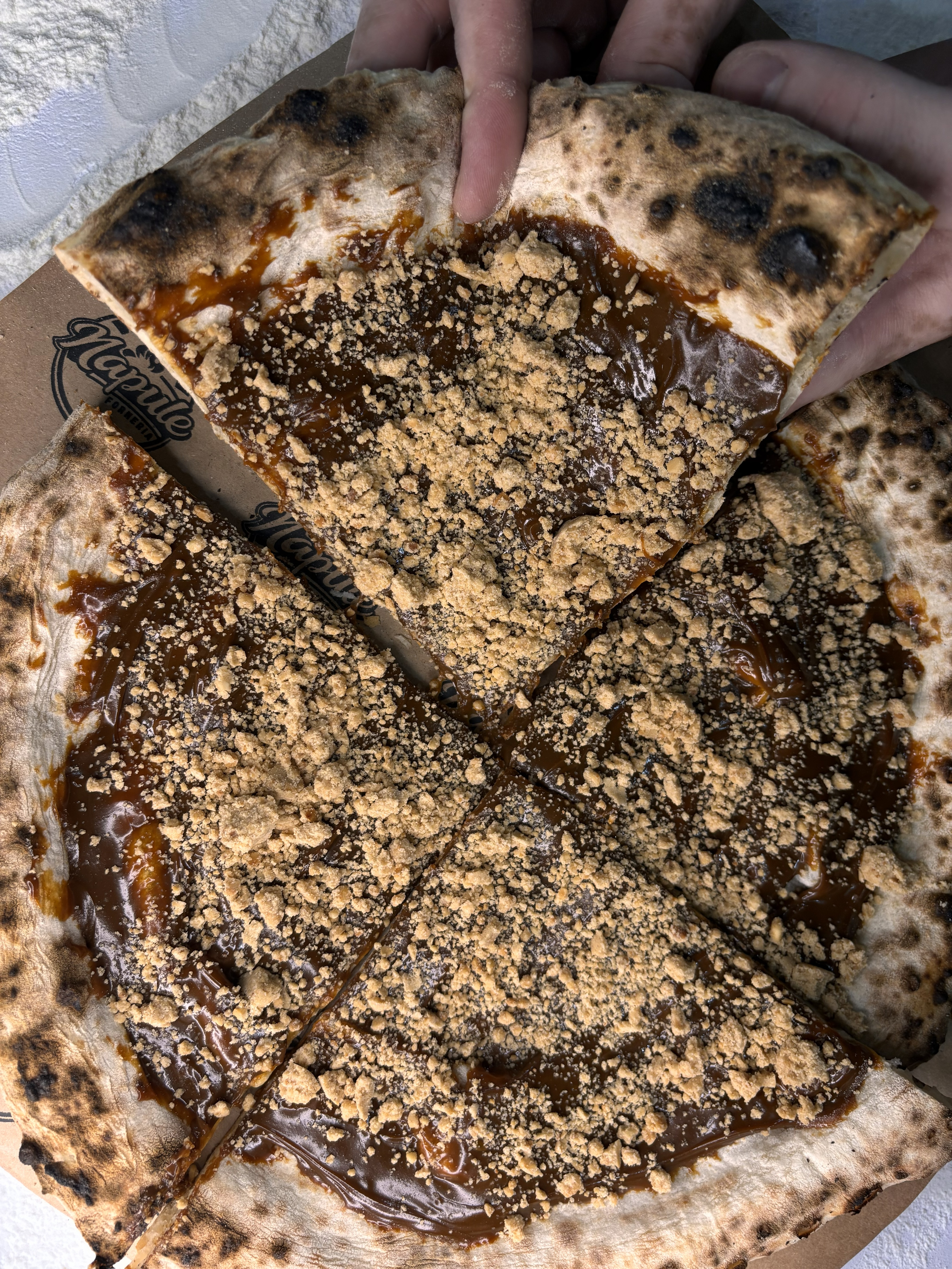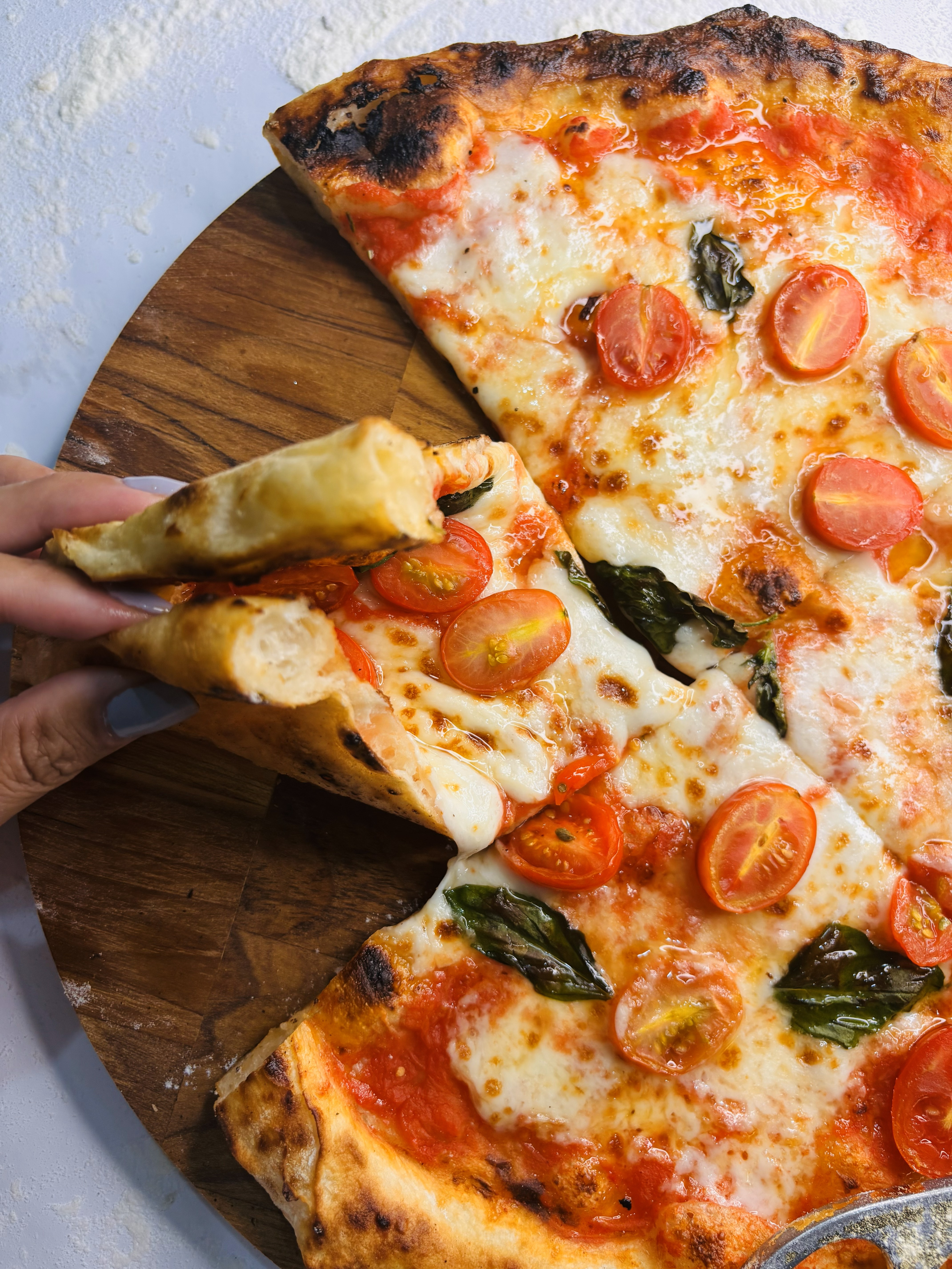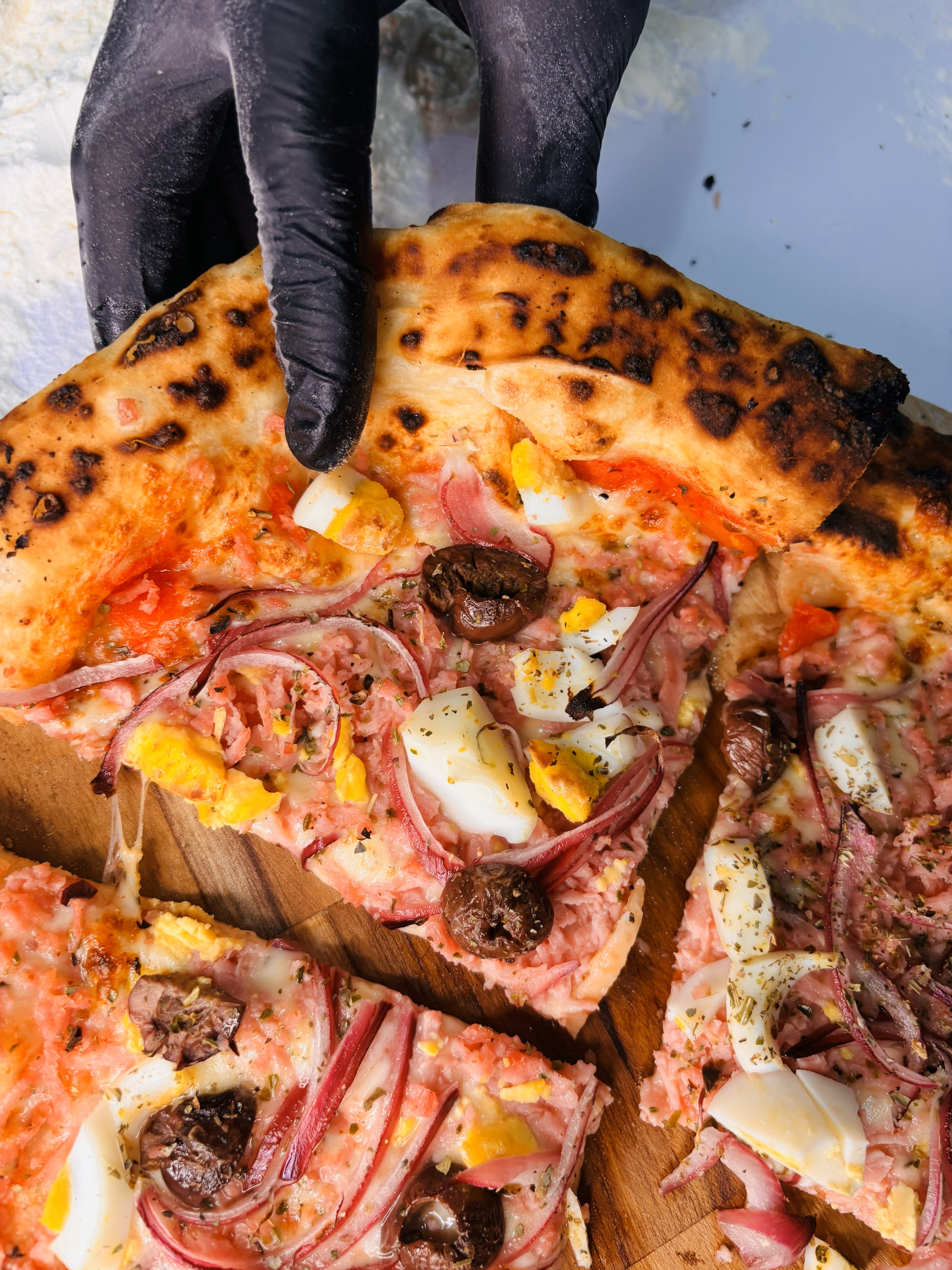Assamos em forno de lastro, mantendo umidade e estrutura. Após o congelamento, a pizza volta ao forno e fica crocante por fora e macia por dentro.